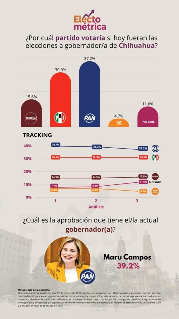 El más reciente estudio de opinión pública realizado por Electométrica en el estado de Chihuahua revela un panorama de competitividad concentrada y una estructura de preferencias que, a marzo de 2026, favorece la continuidad del bloque tradicional en la entidad.